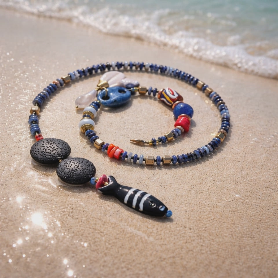 Colier din Sodalit, margele Myiuki, sticla Krobo si lava stone. Detalii de coral, hematite si sidef. Detaliu peste din os. Inchizatoare din cupru.